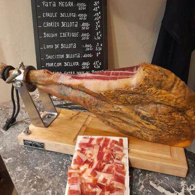 Nous proposons ainsi la pata negra, l'épaule Bellota, le chorizo Bellota, le saucisson Bellota, le boudin Ibérique...