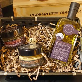 Délices d'artichauts, Crémade d'olives noires ou vertes, Huile d'olive, Tapenade d'olives noires.